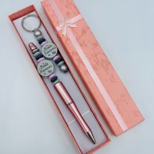 Kugelschreiber in leuchtend grün, mit Motiv „Herz“ und einem kleinen gelben Smilie Anhänger, in einer schwarzen Geschenkbox.